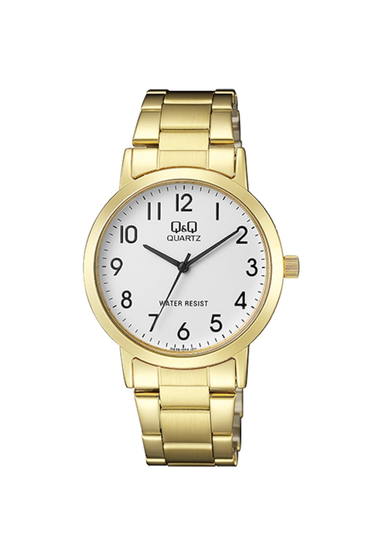 - secunda Rezistenta la apa: 3 atm Cadran Material geam: cristal mineral Culoare cadran: alb Culoare indici: negru Tip citire cadran: cifre arabe Carcasa Forma carcasa: rotunda Material carcasa: alama Culoare carcasa: auriu Diametru carcasa: 39 mm Grosime carcasa: 8 mm Curea/bratara Tip: bratara Material curea/bratara: metal Culoare curea/bratara: auriu