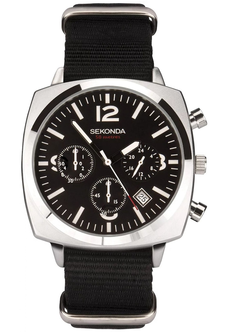 Caracteristici generale Tip mecanism: quartz Tip display: analog Rezistenta la apa: 5 atm Ambalaj: produsul este livrat cu un certificat de autenticitate. Cadran Material geam: cristal mineral Culoare cadran: negru Carcasa Material carcasa: metal Culoare carcasa: negru Curea/bratara Tip: curea Material curea/bratara: textil Culoare curea/bratara: negru