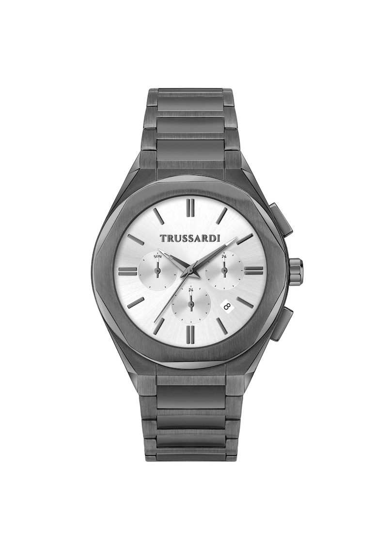 - cronograf Rezistenta la apa: 5 atm Cadran Material geam: cristal mineral Culoare cadran: argintiu Tip citire cadran: linii Carcasa Forma carcasa: rotunda Material carcasa: otel Culoare carcasa: gri Diametru carcasa: 44 mm Curea/bratara Tip: bratara Material curea/bratara: otel Culoare curea/bratara: gri