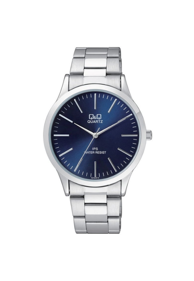 Caracteristici generale Tip mecanism: quartz Stil: elegant Tip display: analog Colectie: standard Functii: ora Cadran Material geam: cristal mineral Culoare cadran: albastru Tip citire cadran: linii Carcasa Forma carcasa: rotunda Material carcasa: alama Culoare carcasa: argintiu Diametru carcasa: 40 mm Curea/bratara Tip: bratara Material curea/bratara: otel Culoare curea/bratara: bicolor