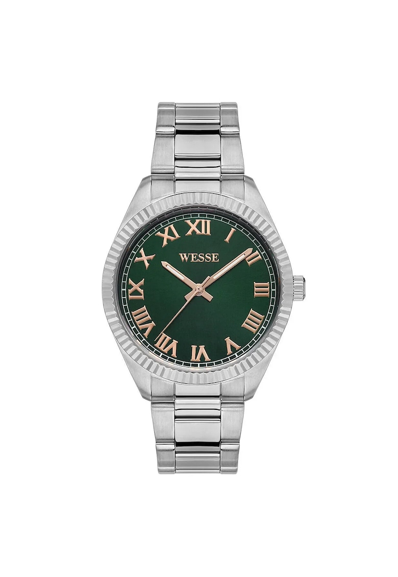 Caracteristici generale Tip mecanism: quartz Stil: casual Denumire mecanism: miyota Tip display: analog Rezistenta la apa: 5 atm Cadran Material geam: cristal mineral Culoare cadran: verde militar Carcasa Forma carcasa: rotunda Material carcasa: otel Culoare carcasa: argintiu Dimensiune carcasa: 41 x 41 Diametru carcasa: 41 mm Curea/bratara Tip: bratara Material curea/bratara: otel Culoare curea/bratara: argintiu