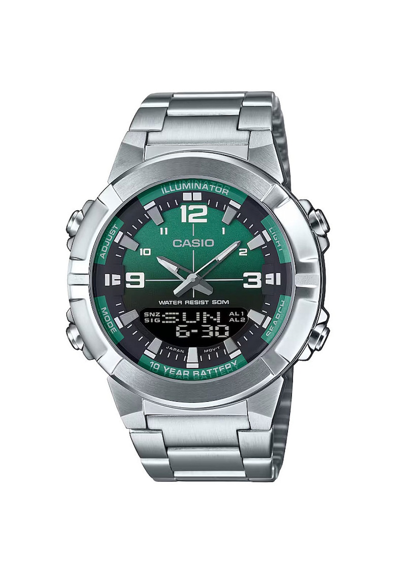 Caracteristici generale Tip mecanism: quartz Denumire mecanism: quartz Tip display: hibrid Functii: afisare data Rezistenta la apa: 5 atm Greutate: 166 g Continut pachet: 1 x cutie originala Cadran Material geam: cristal mineral Culoare cadran: verde Culoare indici: alb Carcasa Forma carcasa: rotunda Material carcasa: inox Culoare carcasa: argintiu Diametru carcasa: 44 mm Curea/bratara Tip: lant Material curea/bratara: inox Culoare curea/bratara: argintiu Latime curea/bratara: 22 mm