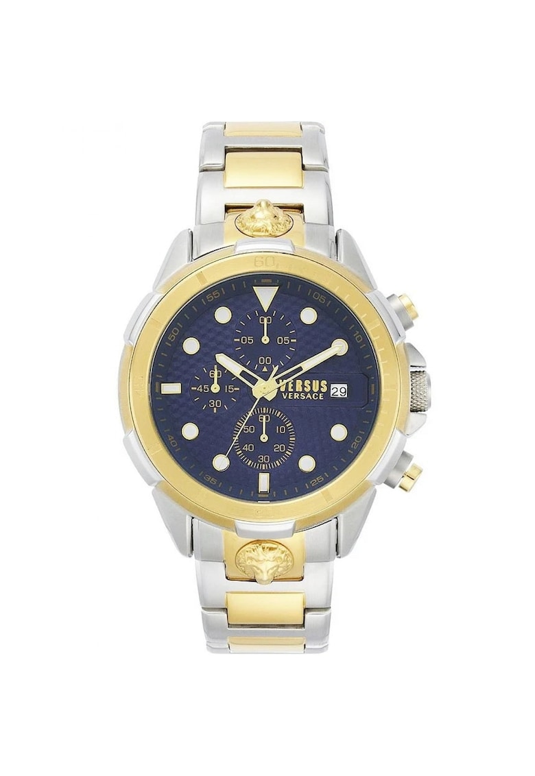 Caracteristici generale Tip mecanism: quartz Stil: casual Tip display: analog Functii: afisare data Rezistenta la apa: 5 atm Cadran Material geam: cristal mineral Culoare cadran: albastru Tip citire cadran: puncte Carcasa Forma carcasa: rotunda Material carcasa: inox Culoare carcasa: auriu Diametru carcasa: 46 mm Curea/bratara Tip: bratara Material curea/bratara: inox Culoare curea/bratara: argintiu