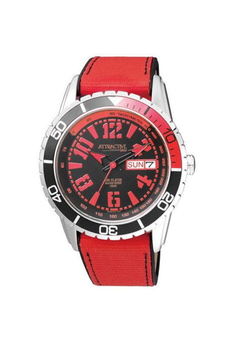Caracteristici generale Tip mecanism: quartz Stil: casual Tip display: analog Rezistenta la apa: 5 atm Cadran Material geam: cristal mineral Carcasa Forma carcasa: rotunda Material carcasa: otel Dimensiune carcasa: 47 x 47 Curea/bratara Material curea/bratara: textil Culoare curea/bratara: rosu