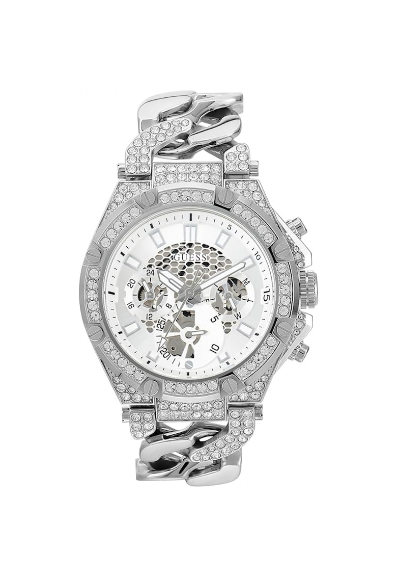 Caracteristici generale Tip mecanism: quartz Stil: casual Tip display: analog Functii: afisare data Rezistenta la apa: 5 atm Cadran Material geam: cristal mineral Culoare cadran: argintiu Tip citire cadran: linii Carcasa Forma carcasa: rotunda Material carcasa: inox Culoare carcasa: argintiu Diametru carcasa: 46 mm Curea/bratara Tip: bratara Material curea/bratara: inox Culoare curea/bratara: argintiu