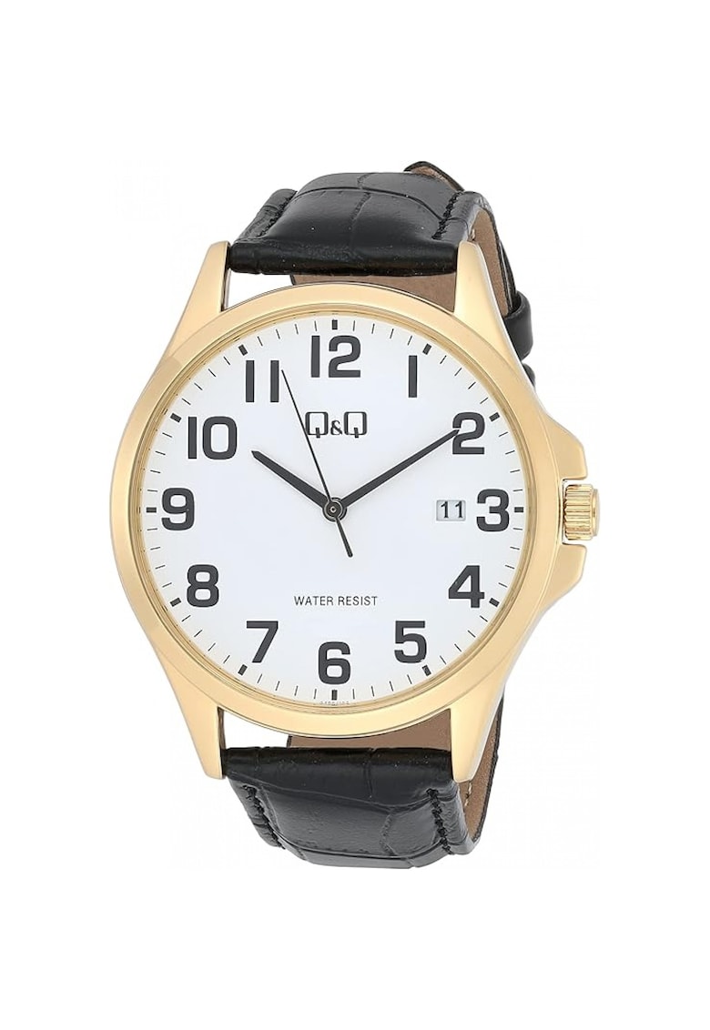 Caracteristici generale Tip mecanism: quartz Stil: casual Tip display: analog Functii: afisare data Rezistenta la apa: 3 atm Cadran Material geam: cristal mineral Culoare cadran: alb Tip citire cadran: cifre arabe Carcasa Forma carcasa: rotunda Material carcasa: inox Culoare carcasa: auriu Diametru carcasa: 40 mm Curea/bratara Tip: curea Material curea/bratara: piele naturala Culoare curea/bratara: negru