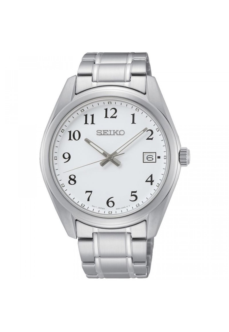Caracteristici generale Tip mecanism: quartz Stil: casual Tip display: analog Functii: afisare data Rezistenta la apa: 10 atm Cadran Material geam: cristal safir Culoare cadran: alb Tip citire cadran: cifre arabe Carcasa Forma carcasa: rotunda Material carcasa: inox Culoare carcasa: argintiu Diametru carcasa: 40 mm Curea/bratara Tip: bratara Material curea/bratara: inox Culoare curea/bratara: argintiu