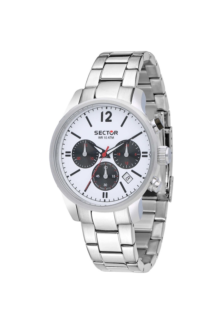 Caracteristici generale Tip mecanism: quartz Stil: elegant Tip display: analog Functii: cronograf Rezistenta la apa: 10 atm Cadran Material geam: cristal mineral Culoare cadran: alb Tip citire cadran: linii Carcasa Forma carcasa: rotunda Material carcasa: inox Culoare carcasa: argintiu Diametru carcasa: 42 mm Curea/bratara Tip: bratara Material curea/bratara: inox Culoare curea/bratara: argintiu