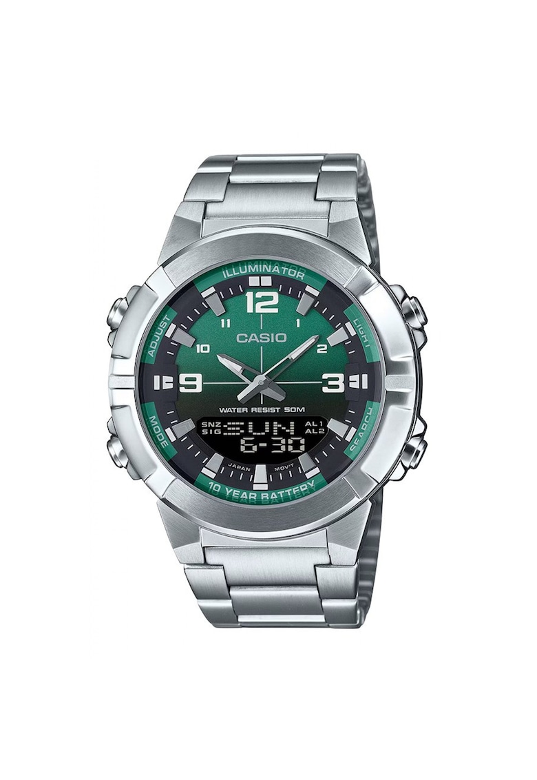 Caracteristici generale Tip mecanism: quartz Stil: casual Tip display: hibrid Functii: afisare data Rezistenta la apa: 5 atm Cadran Material geam: cristal mineral Culoare cadran: verde Tip citire cadran: cifre arabe Carcasa Forma carcasa: rotunda Material carcasa: inox Culoare carcasa: argintiu Diametru carcasa: 44 mm Curea/bratara Tip: bratara Material curea/bratara: inox Culoare curea/bratara: argintiu