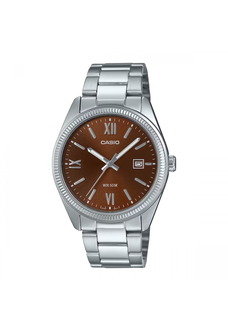 Caracteristici generale Tip mecanism: quartz Stil: elegant Tip display: analog Functii: afisare data Rezistenta la apa: 5 atm Cadran Material geam: cristal mineral Culoare cadran: maro Tip citire cadran: cifre romane Carcasa Forma carcasa: rotunda Material carcasa: inox Culoare carcasa: argintiu Diametru carcasa: 39 mm Curea/bratara Tip: bratara Material curea/bratara: inox Culoare curea/bratara: argintiu