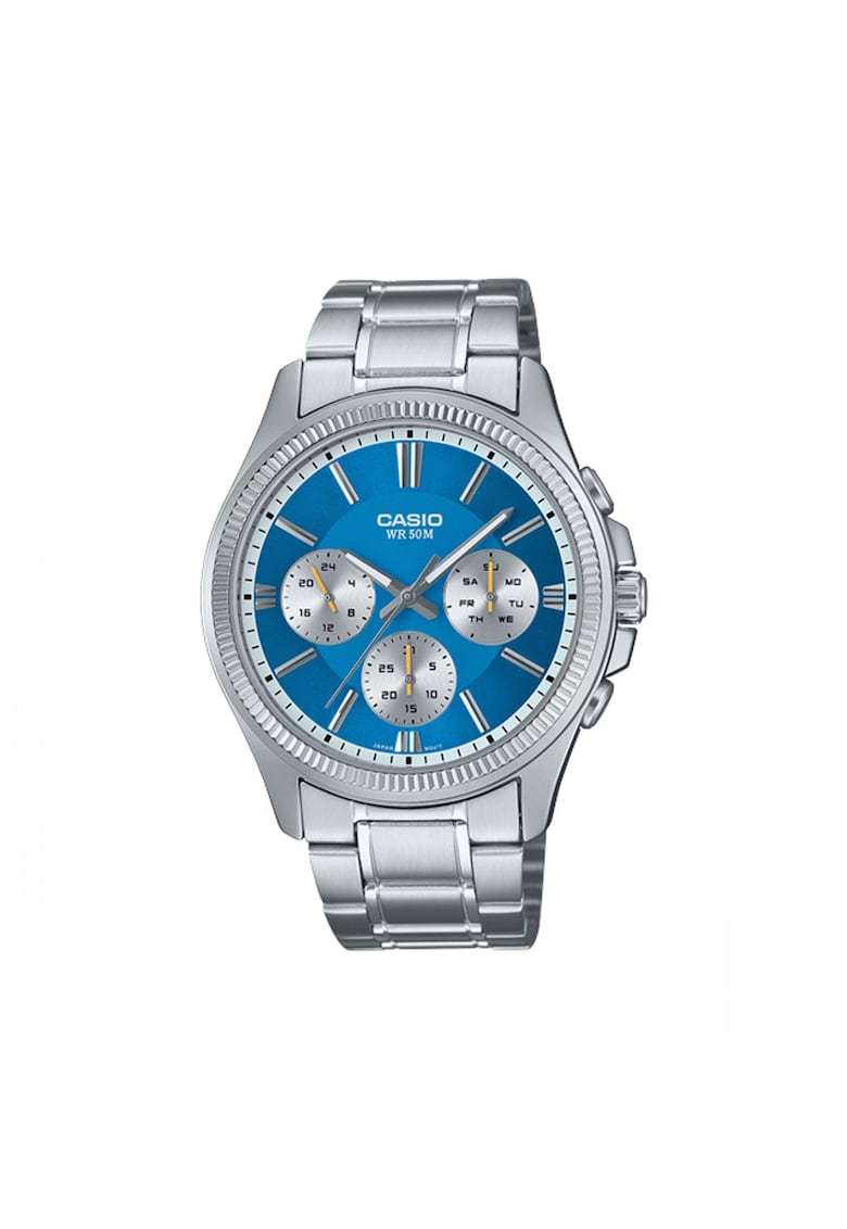 Caracteristici generale Tip mecanism: quartz Stil: elegant Tip display: analog Functii: afisare data Rezistenta la apa: 5 atm Cadran Material geam: cristal mineral Culoare cadran: albastru Tip citire cadran: linii Carcasa Forma carcasa: rotunda Material carcasa: inox Culoare carcasa: argintiu Diametru carcasa: 42 mm Curea/bratara Tip: bratara Material curea/bratara: inox Culoare curea/bratara: argintiu