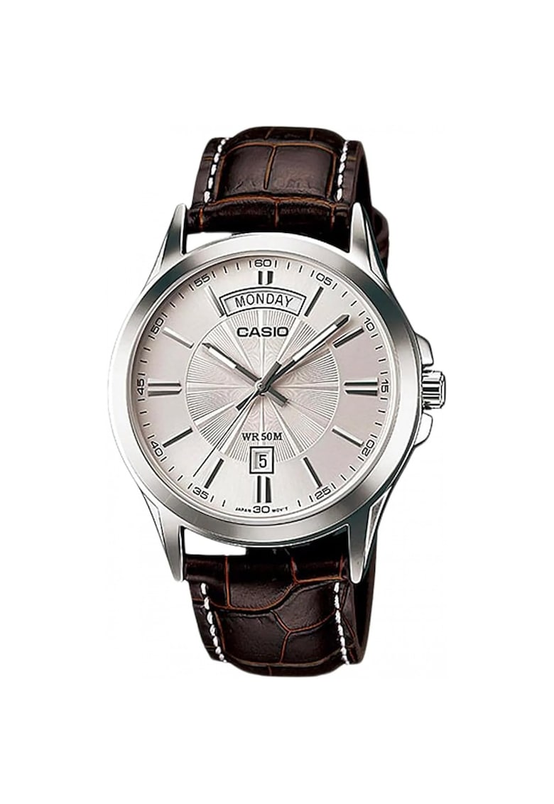 Caracteristici generale Tip mecanism: quartz Stil: casual Tip display: analog Functii: afisare data Rezistenta la apa: 5 atm Cadran Material geam: cristal mineral Culoare cadran: argintiu Tip citire cadran: linii Carcasa Forma carcasa: rotunda Material carcasa: inox Culoare carcasa: argintiu Diametru carcasa: 40 mm Curea/bratara Tip: curea Material curea/bratara: piele naturala Culoare curea/bratara: maro
