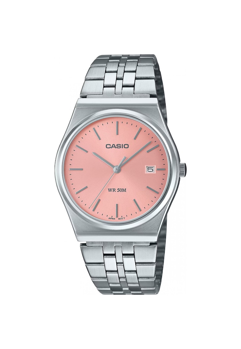 Caracteristici generale Tip mecanism: quartz Stil: casual Tip display: analog Functii: afisare data Rezistenta la apa: 5 atm Cadran Material geam: cristal mineral Culoare cadran: roz Tip citire cadran: linii Carcasa Forma carcasa: rotunda Material carcasa: inox Culoare carcasa: argintiu Diametru carcasa: 35 mm Curea/bratara Tip: bratara Material curea/bratara: inox Culoare curea/bratara: argintiu