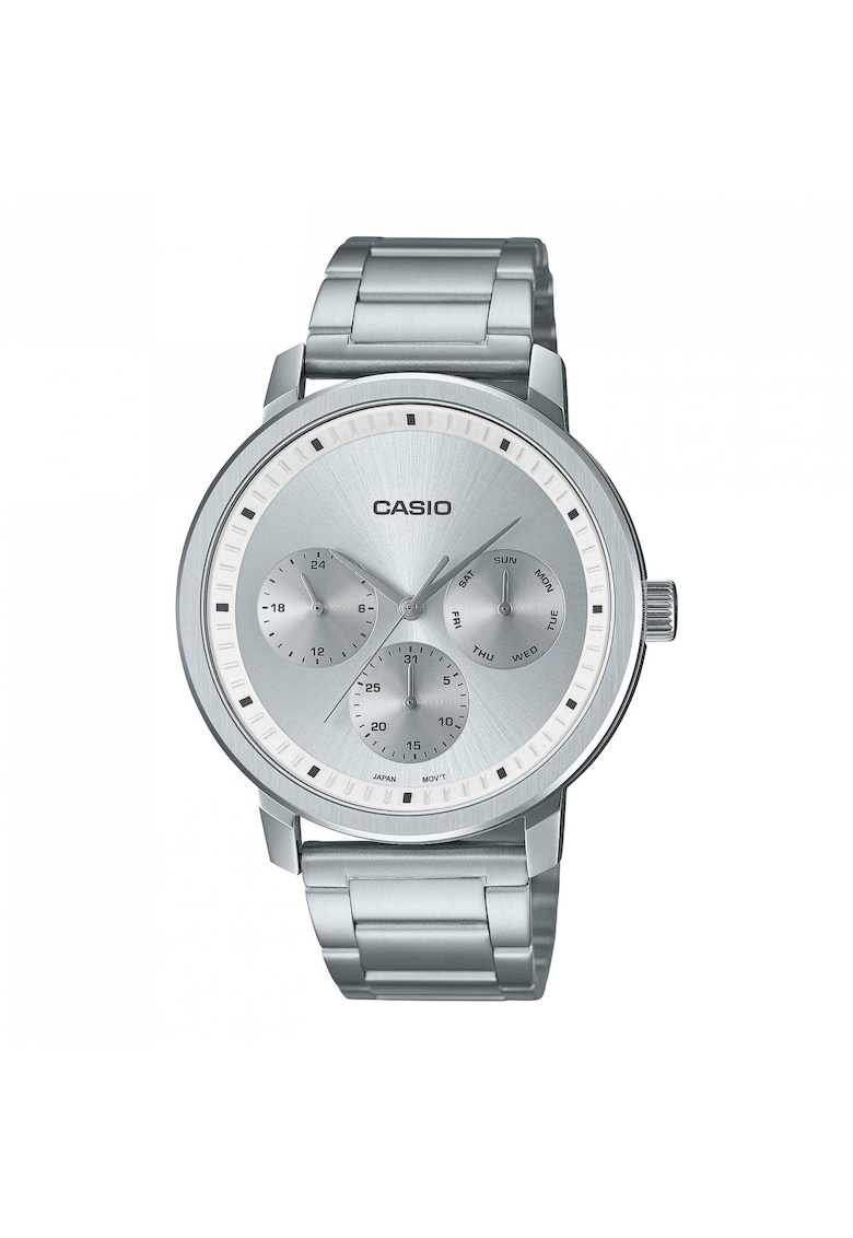 Caracteristici generale Tip mecanism: quartz Stil: casual Tip display: analog Functii: afisare data Rezistenta la apa: 5 atm Cadran Material geam: cristal mineral Culoare cadran: argintiu Tip citire cadran: puncte Carcasa Forma carcasa: rotunda Material carcasa: inox Culoare carcasa: argintiu Diametru carcasa: 41 mm Curea/bratara Tip: bratara Material curea/bratara: inox Culoare curea/bratara: argintiu