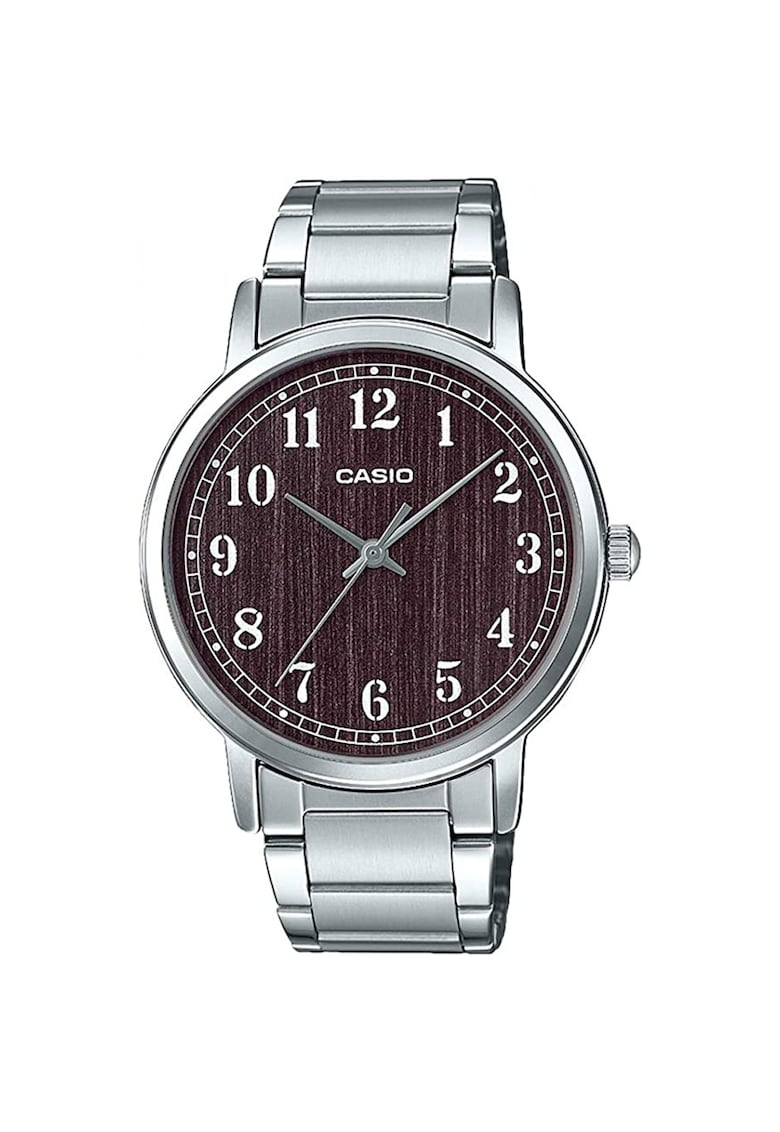 Caracteristici generale Tip mecanism: quartz Tip display: analog Functii: minut Rezistenta la apa: 5 atm Cadran Material geam: cristal mineral Culoare cadran: maro inchis Tip citire cadran: cifre arabe Carcasa Forma carcasa: rotunda Material carcasa: inox Culoare carcasa: argintiu Diametru carcasa: 40 mm Curea/bratara Tip: bratara Material curea/bratara: inox Culoare curea/bratara: argintiu