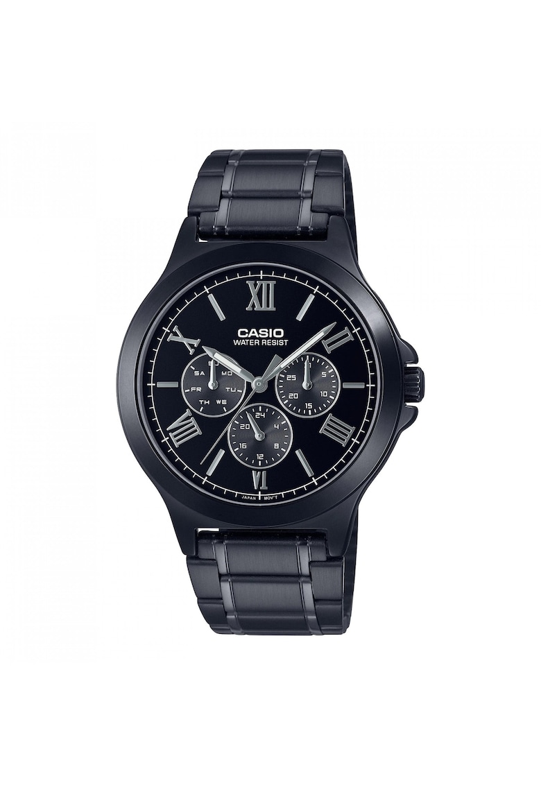 Caracteristici generale Tip mecanism: quartz Stil: casual Tip display: analog Functii: afisare data Rezistenta la apa: 3 atm Cadran Material geam: cristal mineral Culoare cadran: negru Tip citire cadran: cifre romane Carcasa Forma carcasa: rotunda Material carcasa: inox Culoare carcasa: negru Diametru carcasa: 42 mm Curea/bratara Tip: bratara Material curea/bratara: inox Culoare curea/bratara: negru