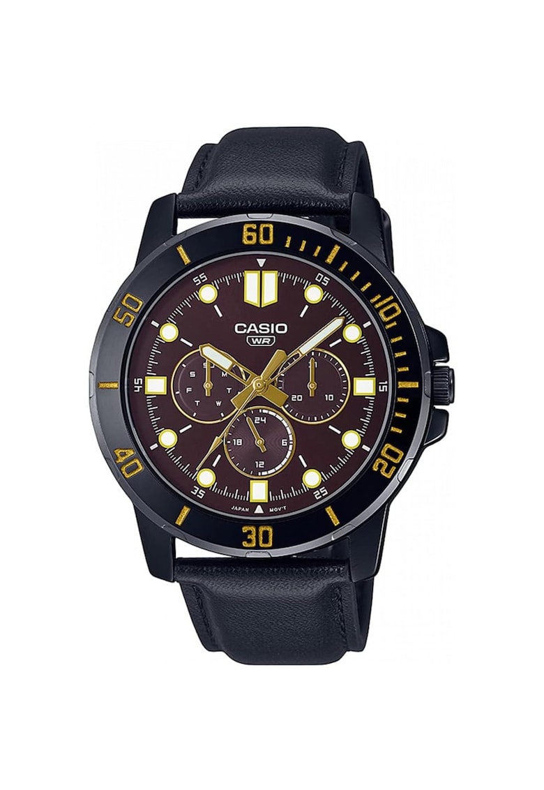 Caracteristici generale Tip mecanism: quartz Stil: casual Tip display: analog Functii: afisare data Rezistenta la apa: 3 atm Cadran Material geam: cristal mineral Culoare cadran: maro Tip citire cadran: puncte Carcasa Forma carcasa: rotunda Material carcasa: inox Culoare carcasa: negru Diametru carcasa: 45 mm Curea/bratara Tip: curea Material curea/bratara: piele naturala Culoare curea/bratara: negru