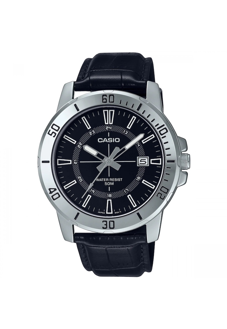 Caracteristici generale Tip mecanism: quartz Stil: casual Tip display: analog Functii: afisare data Rezistenta la apa: 5 atm Cadran Material geam: cristal mineral Culoare cadran: negru Tip citire cadran: linii Carcasa Forma carcasa: rotunda Material carcasa: inox Culoare carcasa: argintiu Diametru carcasa: 45 mm Curea/bratara Tip: curea Material curea/bratara: piele naturala Culoare curea/bratara: negru