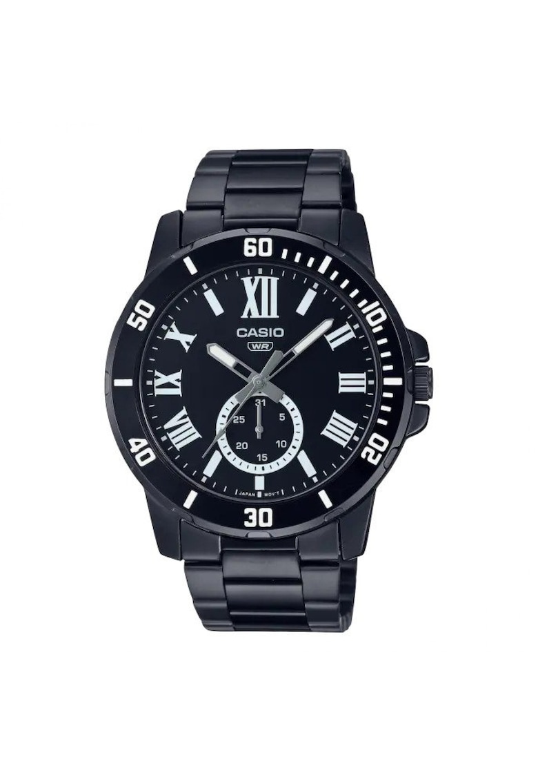 Caracteristici generale Tip mecanism: quartz Stil: casual Tip display: analog Functii: afisare data Rezistenta la apa: 3 atm Cadran Material geam: cristal mineral Culoare cadran: negru Tip citire cadran: cifre romane Carcasa Forma carcasa: rotunda Material carcasa: inox Culoare carcasa: negru Diametru carcasa: 45 mm Curea/bratara Tip: bratara Material curea/bratara: inox Culoare curea/bratara: negru