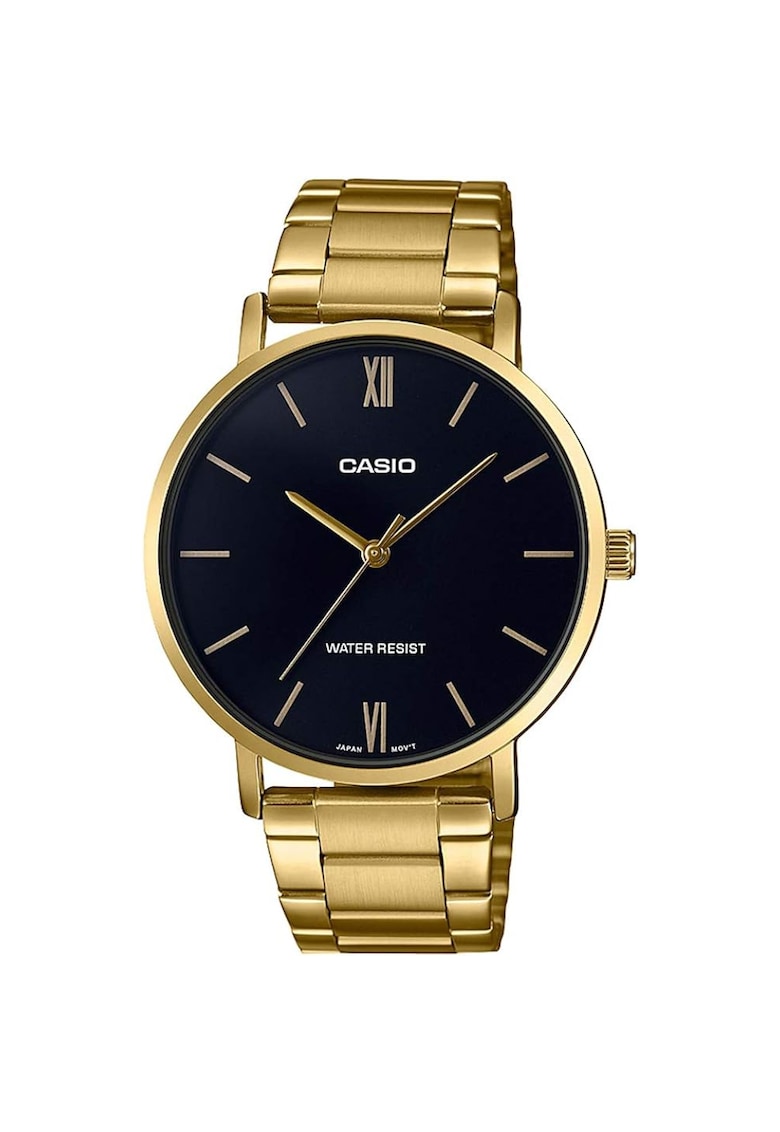 Caracteristici generale Tip mecanism: quartz Stil: casual Tip display: analog Functii: minut Rezistenta la apa: 3 atm Cadran Material geam: cristal mineral Culoare cadran: negru Tip citire cadran: cifre romane Carcasa Forma carcasa: rotunda Material carcasa: inox Culoare carcasa: auriu Diametru carcasa: 46 mm Curea/bratara Tip: bratara Material curea/bratara: inox Culoare curea/bratara: auriu