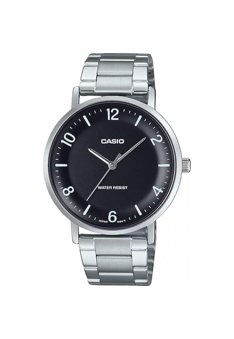 Caracteristici generale Tip mecanism: quartz Stil: casual Tip display: analog Functii: minut Rezistenta la apa: 3 atm Cadran Material geam: cristal mineral Culoare cadran: negru Tip citire cadran: cifre arabe Carcasa Forma carcasa: rotunda Material carcasa: inox Culoare carcasa: argintiu Diametru carcasa: 40 mm Curea/bratara Tip: bratara Material curea/bratara: inox Culoare curea/bratara: argintiu