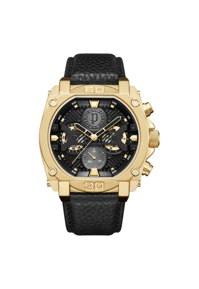Caracteristici generale Tip mecanism: quartz Stil: casual Tip display: analog Functii: afisare data Rezistenta la apa: 3 atm Cadran Material geam: cristal mineral Culoare cadran: negru Tip citire cadran: linii Carcasa Forma carcasa: rotunda Material carcasa: inox Culoare carcasa: auriu Diametru carcasa: 45 mm Curea/bratara Tip: curea Material curea/bratara: piele naturala Culoare curea/bratara: negru