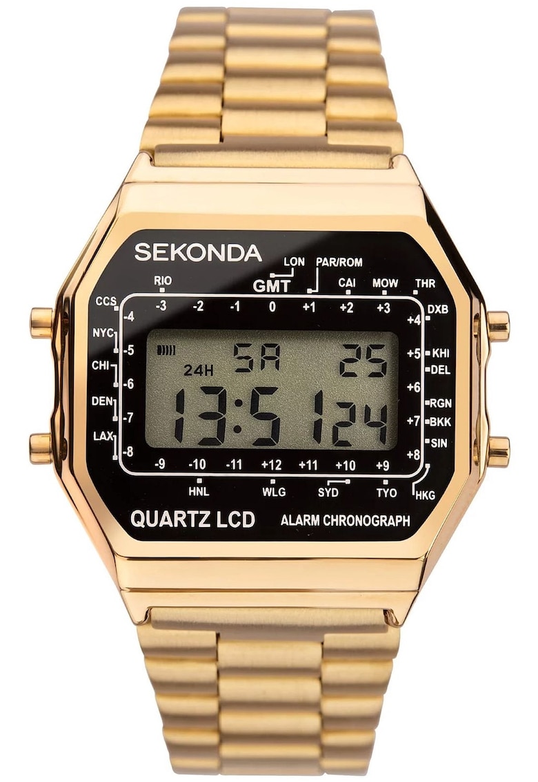 Caracteristici generale Tip mecanism: quartz Stil: sport Tip display: digital Rezistenta la apa: 3 atm Ambalaj: produsul este livrat cu un certificat de autenticitate. Cadran Material geam: cristal mineral Culoare cadran: lcd Carcasa Material carcasa: inox Culoare carcasa: aur Curea/bratara Tip: bratara Material curea/bratara: inox Culoare curea/bratara: aur