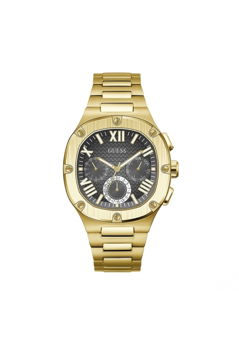 Caracteristici generale Tip mecanism: quartz Stil: casual Tip display: analog Functii: afisare data Rezistenta la apa: 5 atm Cadran Material geam: cristal mineral Culoare cadran: negru Tip citire cadran: cifre romane Carcasa Forma carcasa: rotunda Material carcasa: inox Culoare carcasa: auriu Diametru carcasa: 42 mm Curea/bratara Tip: bratara Material curea/bratara: inox Culoare curea/bratara: auriu