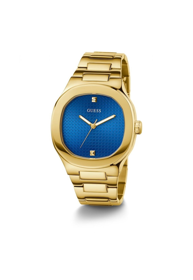 Caracteristici generale Tip mecanism: quartz Stil: casual Tip display: analog Functii: minut Rezistenta la apa: 5 atm Cadran Material geam: cristal mineral Culoare cadran: albastru Tip citire cadran: linii Carcasa Forma carcasa: patrata Material carcasa: inox Culoare carcasa: auriu Diametru carcasa: 42 mm Curea/bratara Tip: bratara Material curea/bratara: inox Culoare curea/bratara: auriu