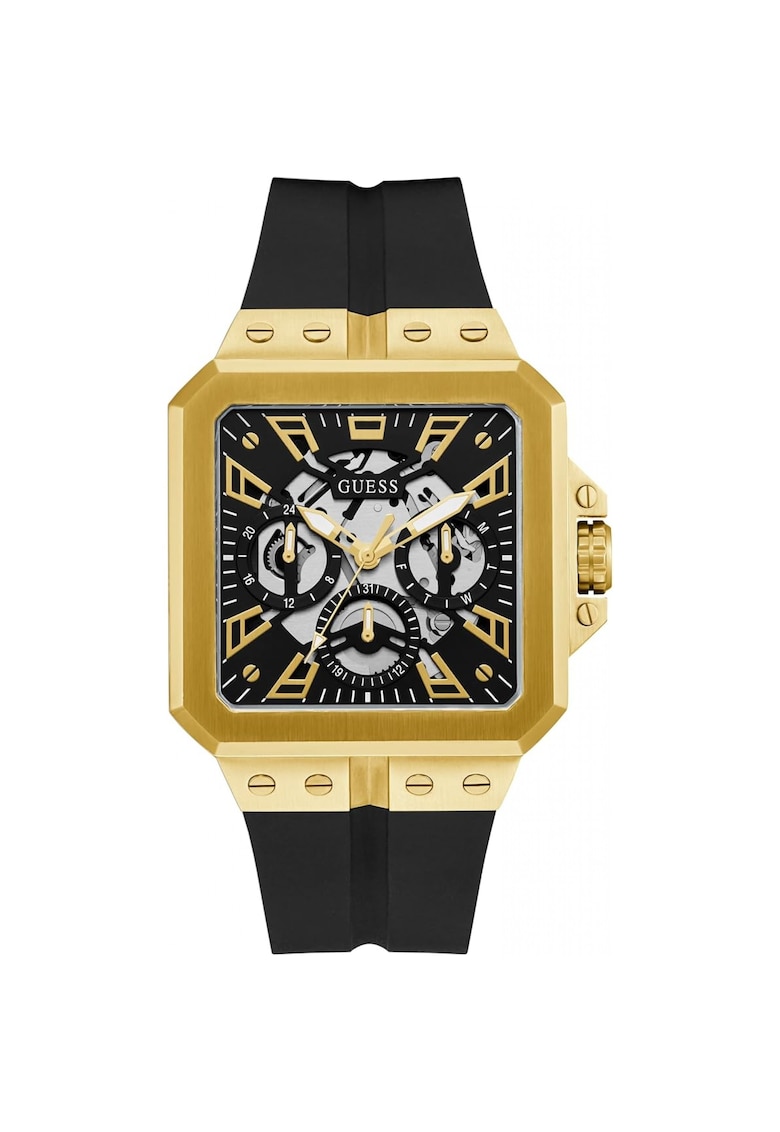 Caracteristici generale Tip mecanism: quartz Stil: casual Tip display: analog Functii: afisare data Rezistenta la apa: 3 atm Cadran Material geam: cristal mineral Culoare cadran: negru Tip citire cadran: linii Carcasa Forma carcasa: rotunda Material carcasa: inox Culoare carcasa: auriu Dimensiune carcasa: 42 x 42 Diametru carcasa: 42 mm Curea/bratara Tip: curea Material curea/bratara: silicon Culoare curea/bratara: negru