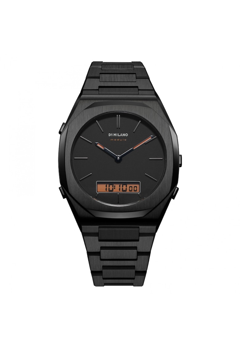 Caracteristici generale Tip mecanism: quartz Stil: casual Tip display: hibrid Functii: afisare data Rezistenta la apa: 5 atm Cadran Material geam: cristal safir Culoare cadran: negru Tip citire cadran: linii Carcasa Forma carcasa: rotunda Material carcasa: inox Culoare carcasa: negru Diametru carcasa: 40 mm Curea/bratara Tip: bratara Material curea/bratara: inox Culoare curea/bratara: negru