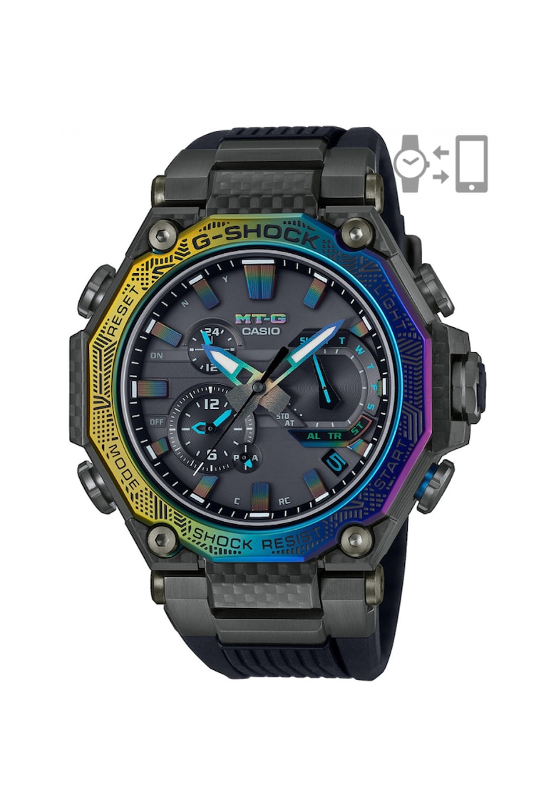 Caracteristici generale Tip mecanism: quartz Stil: casual Tip display: analog Functii: cronograf Rezistenta la apa: 20 atm Ambalaj: produsul este livrat cu un certificat de autenticitate. Cadran Material geam: cristal safir Culoare cadran: negru Tip citire cadran: linii Carcasa Forma carcasa: rotunda Material carcasa: carbon Culoare carcasa: multicolor Diametru carcasa: 51 mm Curea/bratara Tip: curea Material curea/bratara: rasina Culoare curea/bratara: negru