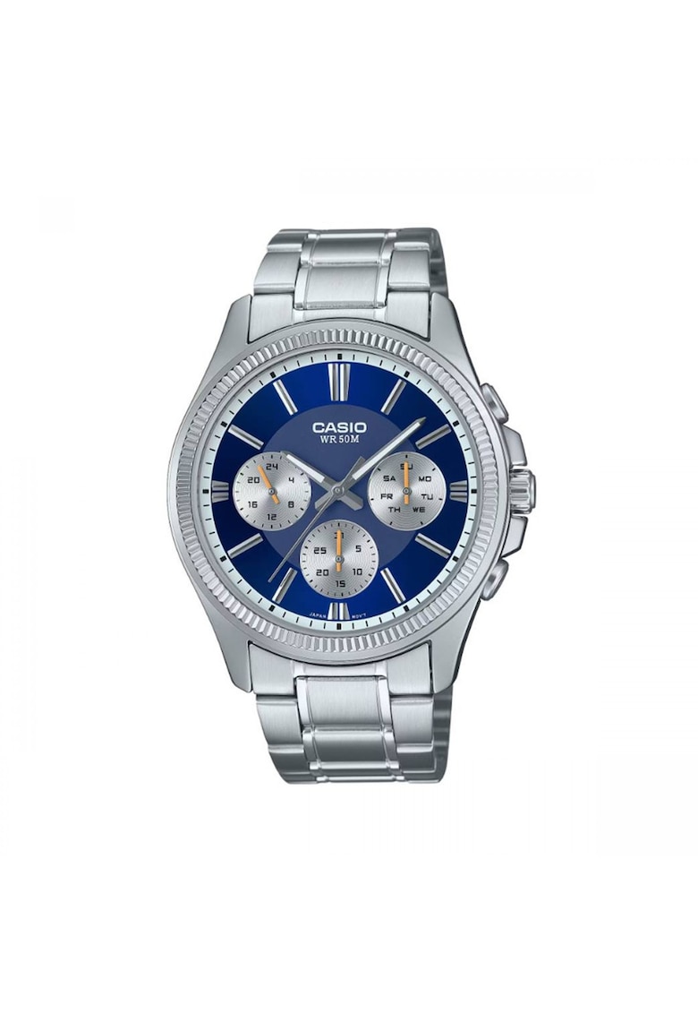 Caracteristici generale Tip mecanism: quartz Stil: elegant Tip display: analog Functii: afisare data Rezistenta la apa: 5 atm Cadran Material geam: cristal mineral Culoare cadran: albastru Tip citire cadran: linii Carcasa Forma carcasa: rotunda Material carcasa: inox Culoare carcasa: argintiu Diametru carcasa: 42 mm Curea/bratara Tip: bratara Material curea/bratara: inox Culoare curea/bratara: argintiu
