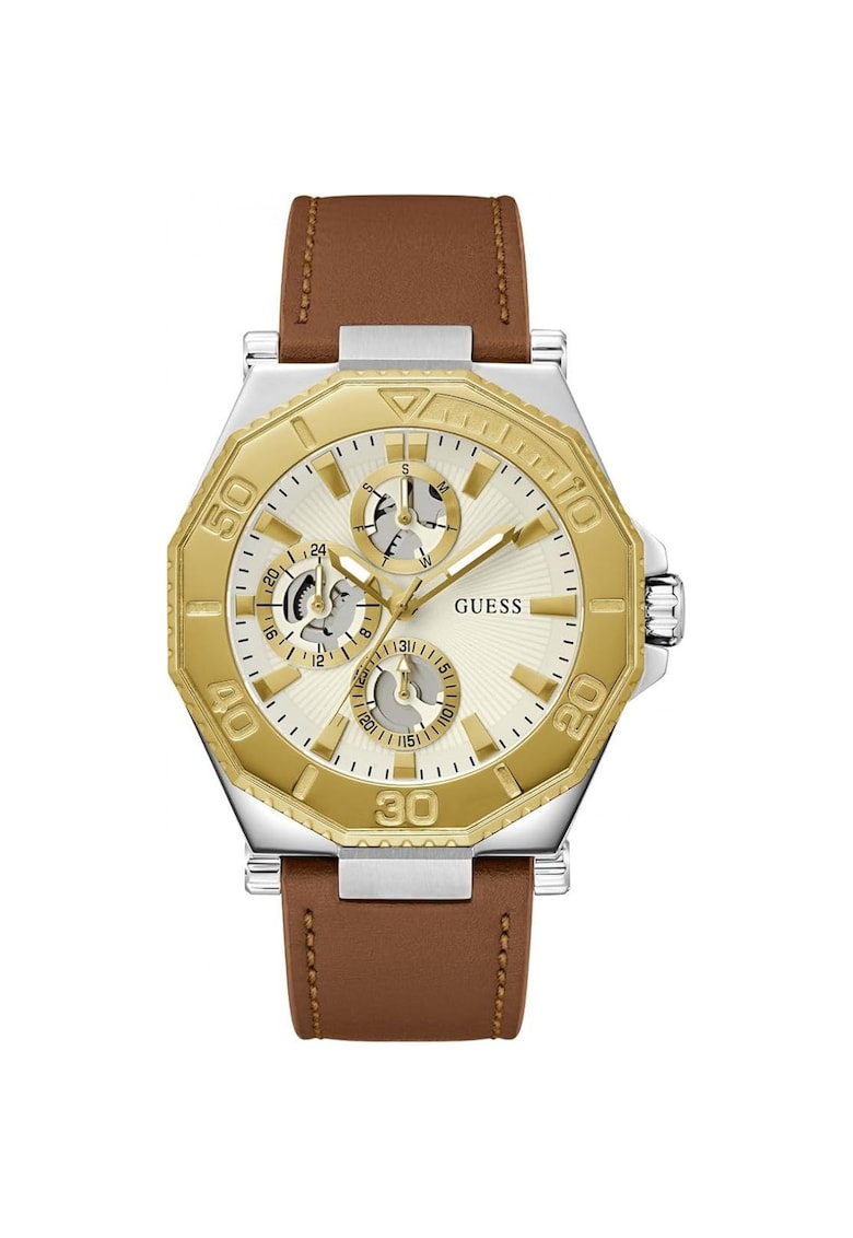 Caracteristici generale Tip mecanism: quartz Stil: casual Tip display: analog Functii: afisare data Rezistenta la apa: 5 atm Cadran Material geam: cristal mineral Culoare cadran: alb Tip citire cadran: linii Carcasa Forma carcasa: rotunda Material carcasa: inox Culoare carcasa: auriu Diametru carcasa: 46 mm Curea/bratara Tip: curea Material curea/bratara: piele naturala Culoare curea/bratara: maro
