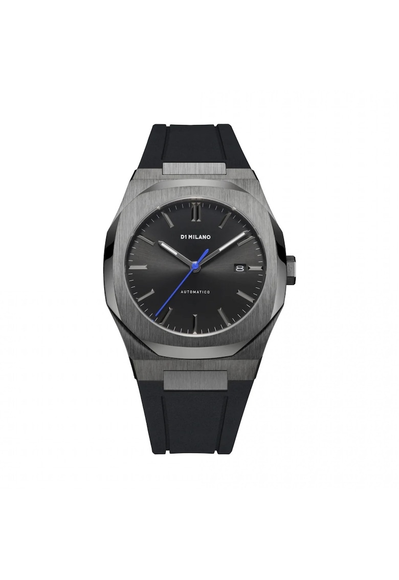 Caracteristici generale Tip mecanism: automatic Stil: casual Tip display: analog Functii: afisare data Rezistenta la apa: 5 atm Cadran Material geam: cristal safir Culoare cadran: negru Tip citire cadran: linii Carcasa Forma carcasa: rotunda Material carcasa: inox Culoare carcasa: gri Diametru carcasa: 41 mm Curea/bratara Tip: curea Material curea/bratara: plastic Culoare curea/bratara: negru