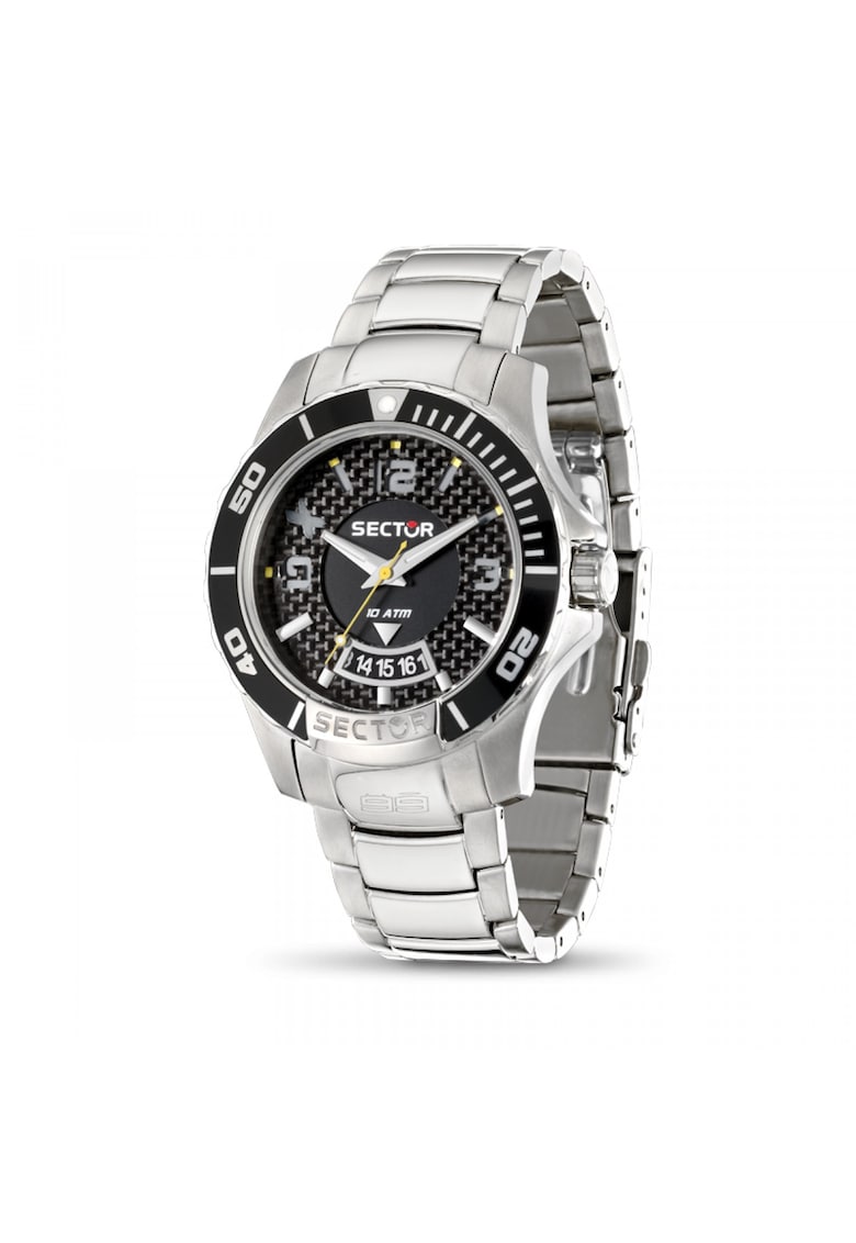 Caracteristici generale Tip mecanism: quartz Stil: casual Tip display: analog Functii: afisare data Rezistenta la apa: 10 atm Cadran Material geam: cristal mineral Culoare cadran: negru Tip citire cadran: cifre arabe Carcasa Forma carcasa: rotunda Material carcasa: inox Culoare carcasa: negru Diametru carcasa: 47 mm Curea/bratara Tip: bratara Material curea/bratara: inox Culoare curea/bratara: argintiu