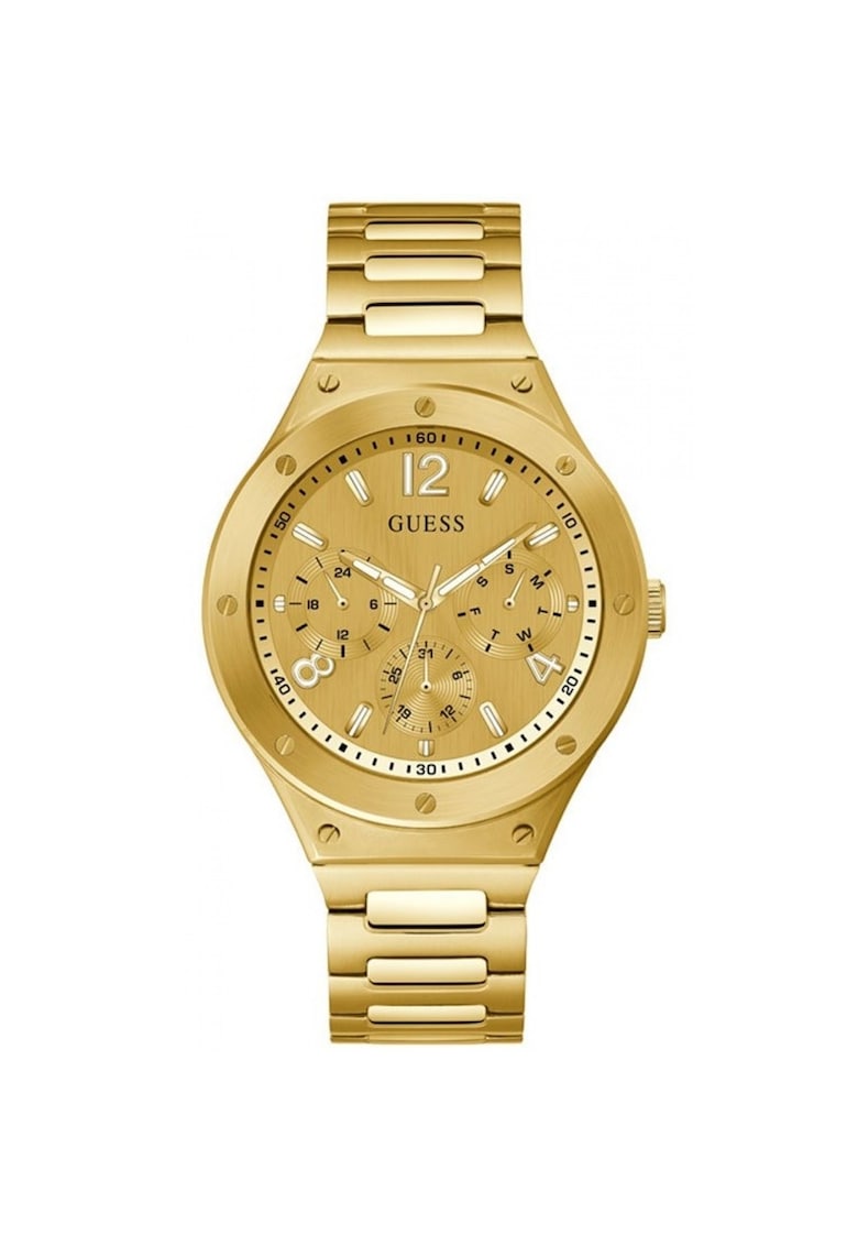 Caracteristici generale Tip mecanism: quartz Stil: casual Tip display: analog Functii: afisare data Rezistenta la apa: 5 atm Cadran Material geam: cristal mineral Culoare cadran: auriu Tip citire cadran: linii Carcasa Forma carcasa: rotunda Material carcasa: inox Culoare carcasa: auriu Diametru carcasa: 44 mm Curea/bratara Tip: bratara Material curea/bratara: inox Culoare curea/bratara: auriu