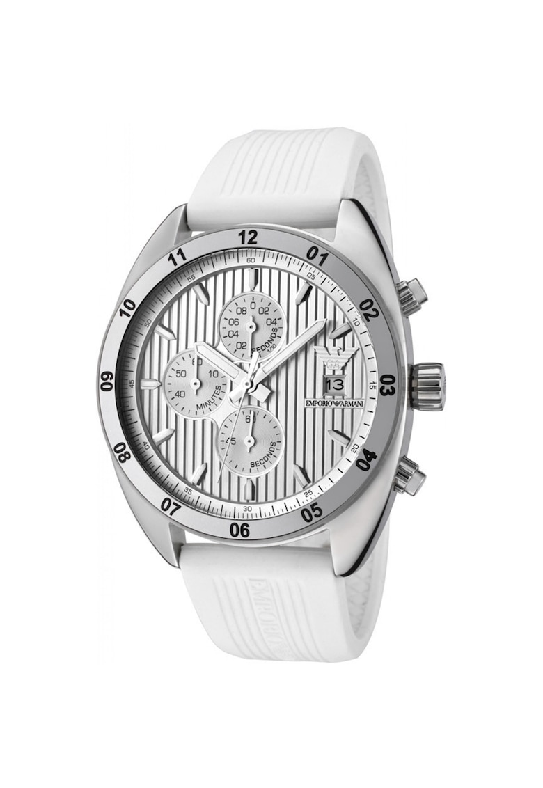 Caracteristici generale Tip mecanism: quartz Stil: casual Tip display: analog Functii: cronograf Rezistenta la apa: 5 atm Cadran Material geam: cristal mineral Culoare cadran: argintiu Tip citire cadran: linii Carcasa Forma carcasa: rotunda Material carcasa: inox Culoare carcasa: argintiu Diametru carcasa: 43 mm Curea/bratara Tip: curea Material curea/bratara: silicon Culoare curea/bratara: alb