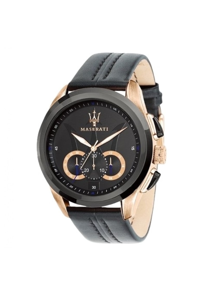 Caracteristici generale Tip mecanism: quartz Stil: casual Tip display: analog Functii: cronograf Rezistenta la apa: 5 atm Cadran Material geam: cristal mineral Culoare cadran: negru Tip citire cadran: linii Carcasa Forma carcasa: rotunda Material carcasa: inox Diametru carcasa: 45 mm Curea/bratara Tip: curea Material curea/bratara: piele naturala Culoare curea/bratara: negru