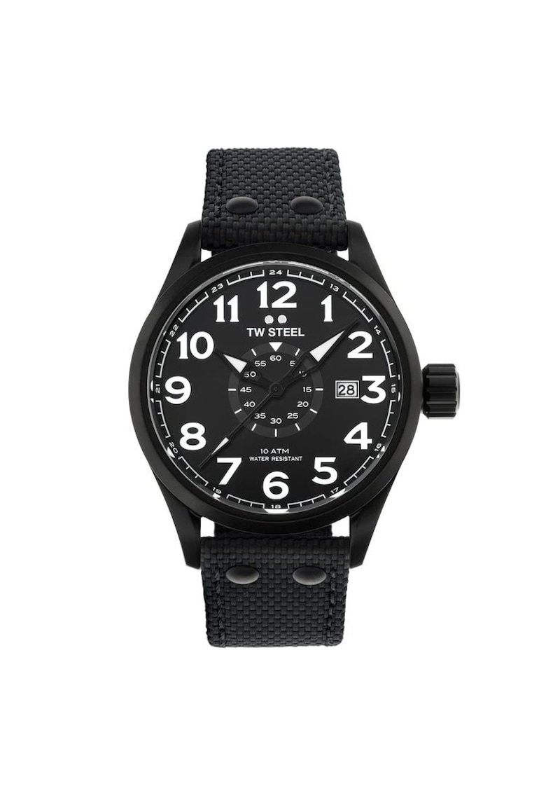 Caracteristici generale Tip mecanism: quartz Stil: casual Tip display: analog Functii: afisare data Rezistenta la apa: 10 atm Cadran Material geam: cristal mineral Culoare cadran: negru Tip citire cadran: cifre arabe Carcasa Forma carcasa: rotunda Material carcasa: inox Culoare carcasa: negru Diametru carcasa: 45 mm Curea/bratara Tip: bratara Material curea/bratara: textil Culoare curea/bratara: negru