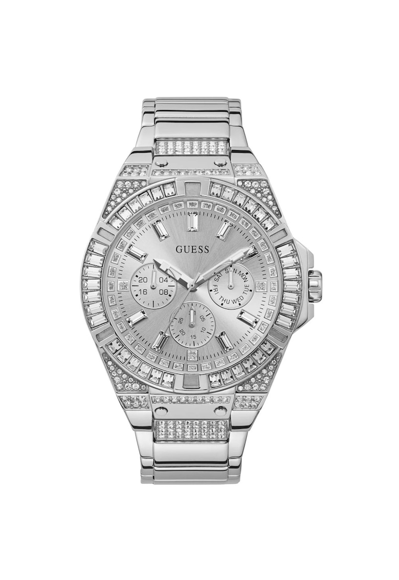 Caracteristici generale Tip mecanism: quartz Stil: elegant Tip display: analog Functii: afisare data Rezistenta la apa: 5 atm Cadran Material geam: cristal mineral Culoare cadran: argintiu Tip citire cadran: linii Carcasa Forma carcasa: rotunda Material carcasa: inox Culoare carcasa: argintiu Diametru carcasa: 47 mm Curea/bratara Tip: bratara Material curea/bratara: inox Culoare curea/bratara: argintiu