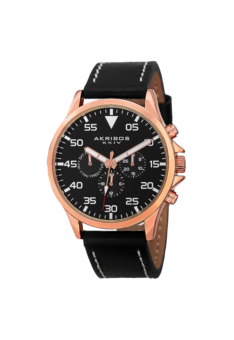 - afisare 24 h Rezistenta la apa: 1 atm Cadran Material geam: cristal mineral Tip citire cadran: cifre arabe Carcasa Forma carcasa: rotunda Material carcasa: aliaj Culoare carcasa: rose gold Curea/bratara Tip: curea Material curea/bratara: piele naturala Culoare curea/bratara: black