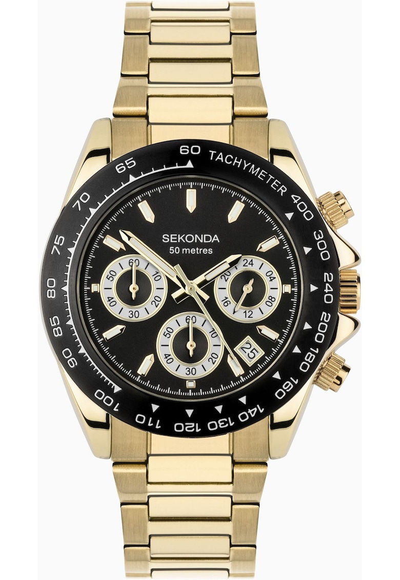 - afisare data Rezistenta la apa: 5 atm Ambalaj: produsul este livrat cu un certificat de autenticitate. Cadran Material geam: cristal mineral Culoare cadran: negru Carcasa Forma carcasa: rotunda Material carcasa: metal Culoare carcasa: aur Curea/bratara Tip: bratara Material curea/bratara: otel