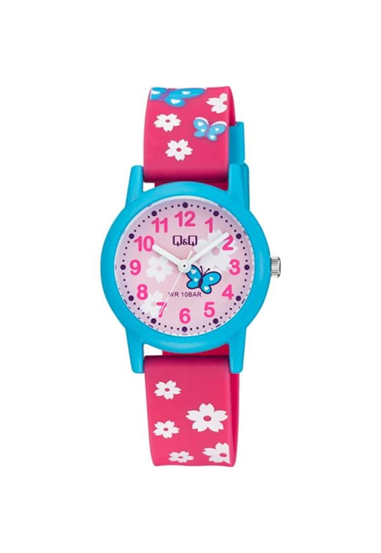 Caracteristici Mecanism: quartz Rezistenta la apa: 10 atm Stil: casual Afisaj: analogic Carcasa: rotunda Culoare carcasa: albastru Functii: ora minut secunda Tip citire cadran: cifre arabe Culoare curea/bratara: roz Sistem inchidere: clasic Compozitie Material carcasa: plastic Material curea/bratara: cauciuc Material geam: plastic Dimensiuni Diametru carcasa: 32 mm Latime curea/bratara: 16 mm