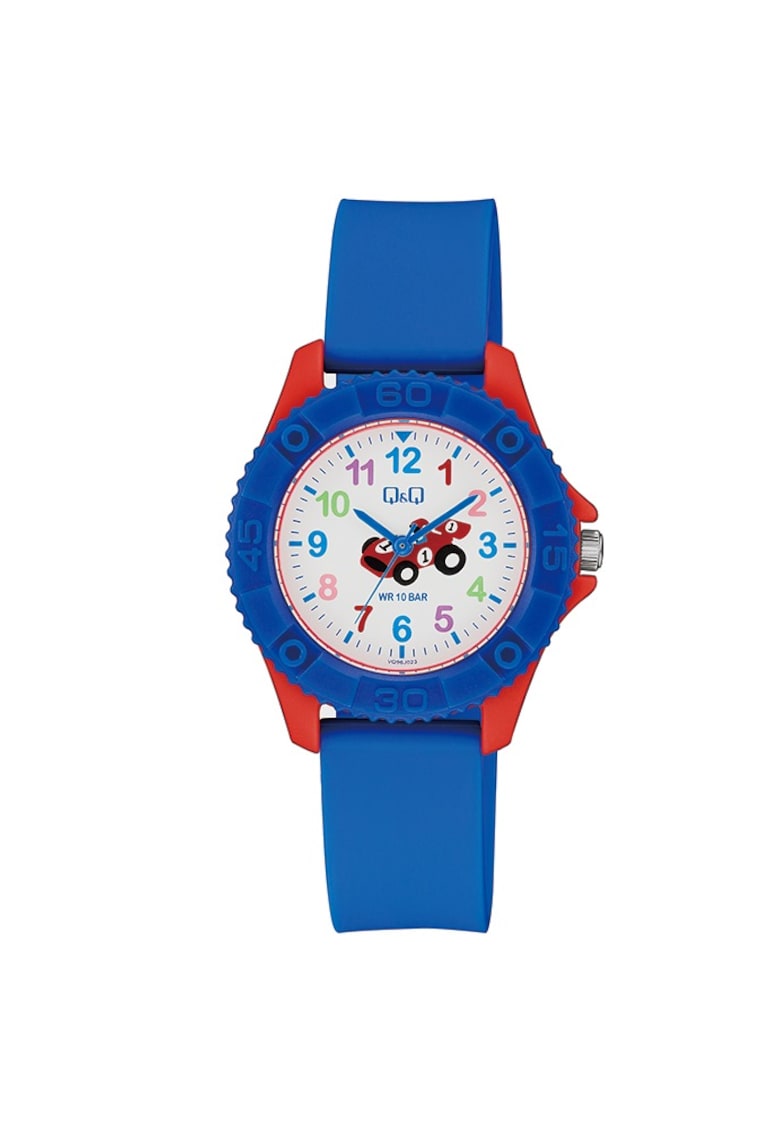 - minute Finisaj carcasa: mat Tip citire cadran: cifre arabe Culoare curea/bratara: albastru / rosu Sistem inchidere: clasic Compozitie Material carcasa: plastic Material curea/bratara: cauciuc Material geam: cristal mineral Finisaj curea/bratara: mat Dimensiuni Diametru carcasa: 3.5 cm Latime curea/bratara: 1.6 cm