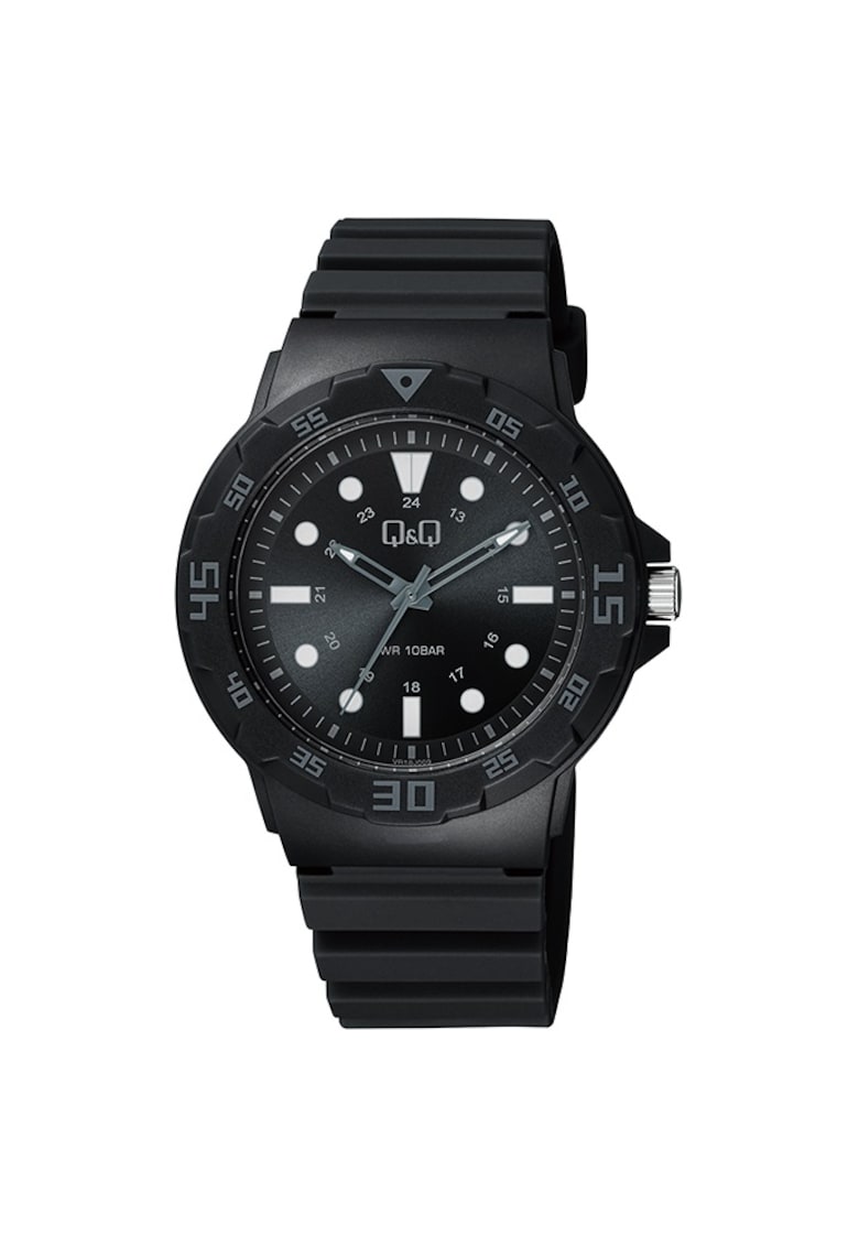 Caracteristici Mecanism: quartz Rezistenta la apa: 10 atm Stil: casual Afisaj: analogic Carcasa: rotunda Culoare carcasa: negru Functii: minut Finisaj carcasa: mat Tip citire cadran: cifre arabe Culoare curea/bratara: negru Sistem inchidere: clasic Compozitie Material carcasa: plastic Material curea/bratara: cauciuc Material geam: acril Finisaj curea/bratara: mat Dimensiuni Diametru carcasa: 43 mm Latime curea/bratara: 18 mm