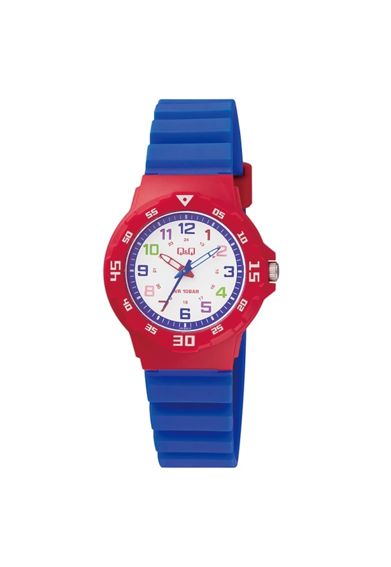 Caracteristici Mecanism: quartz Rezistenta la apa: 10 atm Stil: casual Afisaj: analogic Tematica: clasic Carcasa: rotunda Culoare carcasa: rosu Functii: minut Tip citire cadran: cifre arabe Culoare curea/bratara: albastra Sistem inchidere: clasic Compozitie Material carcasa: plastic Material curea/bratara: cauciuc Material geam: acril Dimensiuni Diametru carcasa: 33 mm Latime curea/bratara: 16 mm
