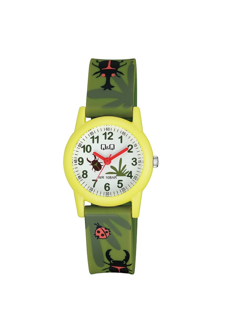 - secunda Tip citire cadran: cifre Culoare curea/bratara: verde Sistem inchidere: catarama Compozitie Material carcasa: plastic Material curea/bratara: cauciuc Material geam: acrilic Dimensiuni Diametru carcasa: 30 mm