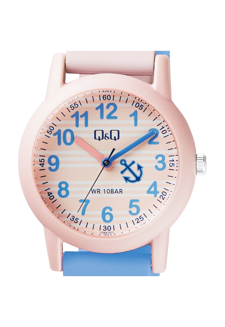 Caracteristici Mecanism: quartz Rezistenta la apa: 10 atm Stil: casual Afisaj: analogic Carcasa: rotunda Culoare carcasa: alb Functii: minut Finisaj carcasa: mat Tip citire cadran: cifre arabe Culoare curea/bratara: bleu/ roz Sistem inchidere: clasic Compozitie Material carcasa: plastic Material curea/bratara: cauciuc Material geam: acril Finisaj curea/bratara: mat Dimensiuni Diametru carcasa: 32 mm Latime curea/bratara: 16 mm