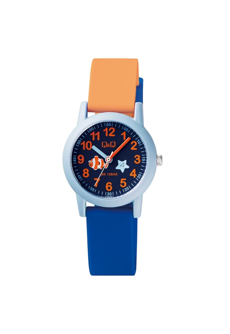 Caracteristici Mecanism: quartz Rezistenta la apa: 10 atm Stil: casual Afisaj: analog Carcasa: rotunda Culoare carcasa: bleu Functii: analog Finisaj carcasa: mat Tip citire cadran: cifre arabe Culoare curea/bratara: portocaliu/bleumarin Sistem inchidere: catarama Compozitie Material carcasa: plastic Material curea/bratara: plastic Material geam: acrilic Dimensiuni Diametru carcasa: 32 mm Latime curea/bratara: 16 mm